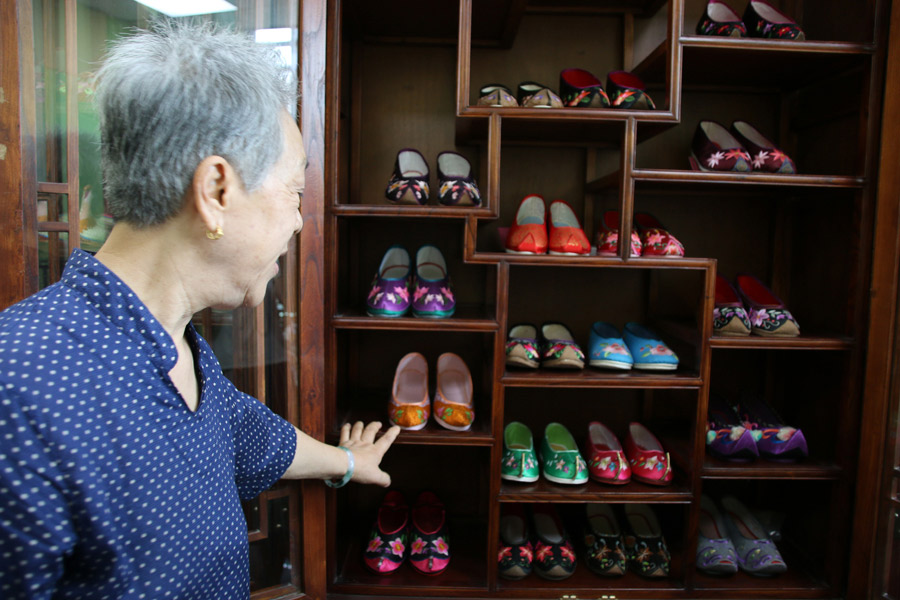 Ten enthusiasts of traditional Chinese embroidery worked under the wing of embroidered shoe-making master Wang Guanqin in Beijing on July 21.