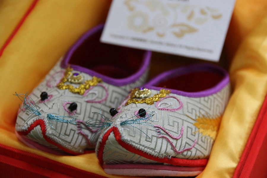 Chinese zodiac embroidered shoes by Wang Guanqin reflect the sign of the rat, July 21, 2018. [Photo by Wang Qiao/chinadaily.com.cn] |