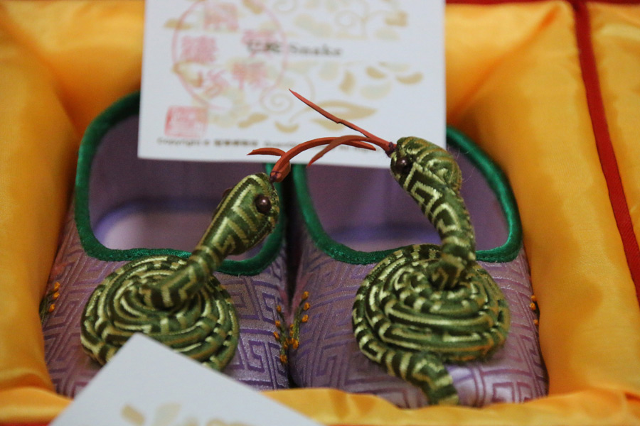 A coiled snake from the Chinese zodiac rises from the toes of a pair of embroidered shoes made by Wang Guanqin, July 21, 2018. [Photo by Wang Qiao/chinadaily.com.cn] |