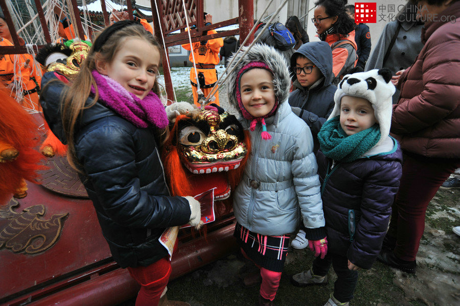法國三姐妹和“拉線獅子”合影 [攝影:涂雄]