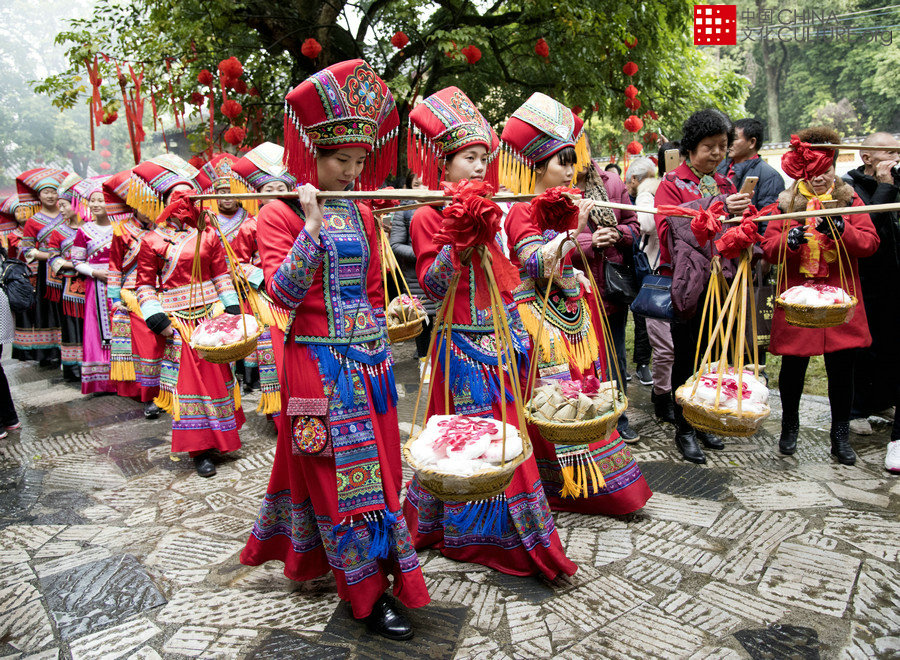 春節(jié),是壯族同胞取親的佳日,新郎家送上各種禮品,到新娘家迎娶新娘。[攝影:黃善明]