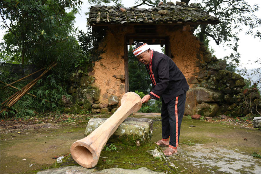Villager Pan Zhenwu makes a Huangni drum in Jinxiu Yao autonomous county, South China's Guangxi Zhuang autonomous region, Aug 1, 2018. [Photo/Xinhua]
