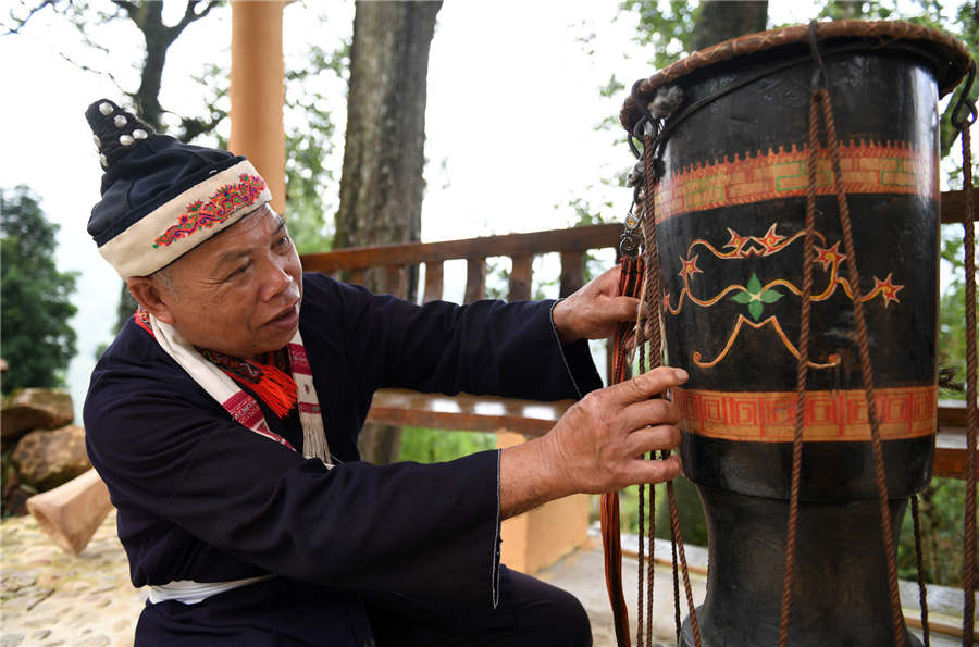 Villager Pan Zhiming checks a Huangni drum in Jinxiu Yao autonomous county, South China's Guangxi Zhuang autonomous region, Aug 1, 2018. [Photo/Xinhua]