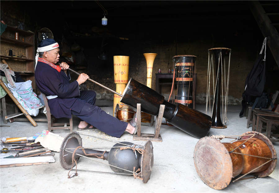 Villager Pan Zhiming makes a Huangni drum in Jinxiu Yao autonomous county, South China's Guangxi Zhuang autonomous region, Aug 1, 2018. [Photo/Xinhua]