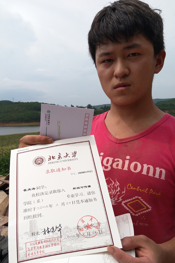 Cui showcases his admission letter from the university. [PHOTO BY CHEN YAOBANG/FOR CHINA DAILY] |