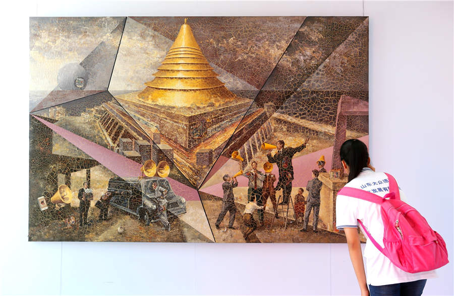 A visitor views a painting at the exhibition in Qingdao, Shandong province, Aug 3, 2018. [Photo by Liang Xiaopeng/Asianewsphoto]