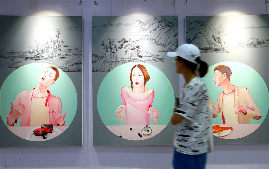 A visitor views artworks at the exhibition in Qingdao, Shandong province, Aug 3, 2018. [Photo by Liang Xiaopeng/Asianewsphoto]