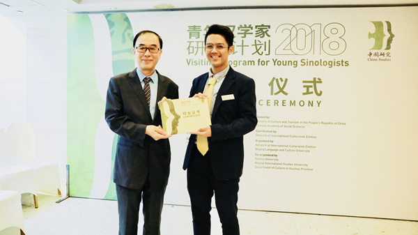 Paul John Edrada Alegado, visiting scholar from the Philippines receives his completion certificate from Professor Huang Zhuoyue, director of Chinese Culture Translation and Studies Research Center and Sinology Studies Institute at Beijing Language and Culture University, during the closing ceremony of the 2018?Visiting Program for Young Sinologists, July 24, 2018. [Photo provided to Chinaculture.org] |