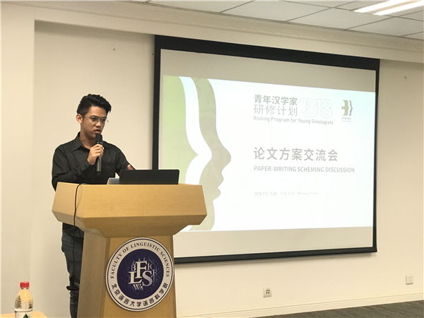 Alegado presents his thesis in front of a panel at Beijing Language and Culture University.?[Photo provided to Chinaculture.org] |