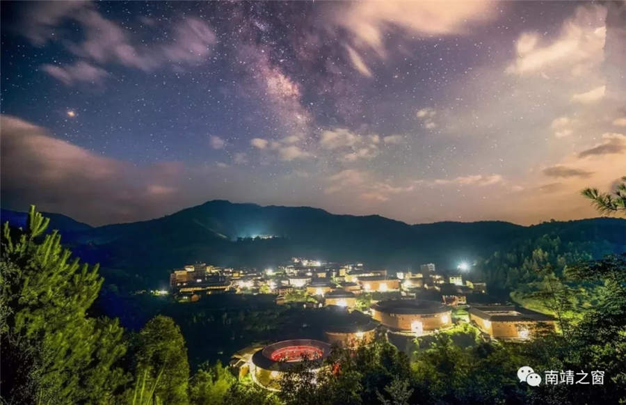 The beautiful starry sky above tulou or earthen buildings in Fujian province. [Photo provided to chinadaily.com.cn]