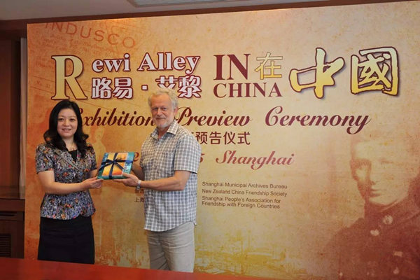 David Bromwich (right) joins the opening ceremony of Rewi Alley in China exhibition held in Shanghai, Sept 3, 2013. [Photo/shfao.gov.cn] |