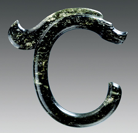 The jade pig-dragon was usually meticulously polished. Many have been found in what is today northern and northeastern China. The creature with an elongated body and flowing mane resembles a dragon-Chinese people traditionally call themselves descendents of the mythical, rain-producing, supernatural being-with a protruding snout.