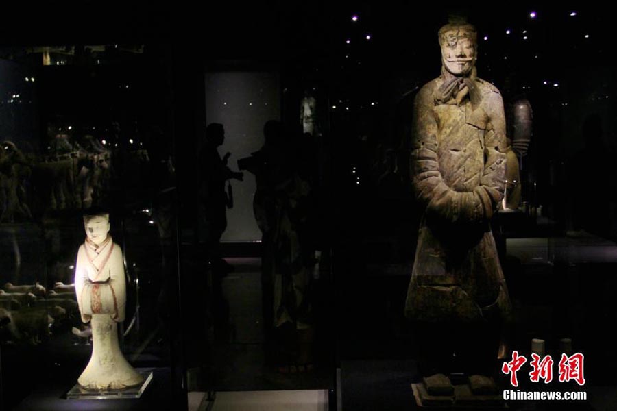Terracotta figures from ancient China's Qin Dynasty (221-206 BC) and its successor Han Dynasty (206 BC-220) are displayed together at a theme exhibition at Emperor Qinshihuang's Mausoleum Site Museum in Xi'an, Shaanxi province, on Aug 7, 2018. More than 140 sets of cultural relics are on show through August 2019, narrating the two dynasties' history, military and pottery cultures - its inheritance and innovative development. [Photo/Chinanews.com]