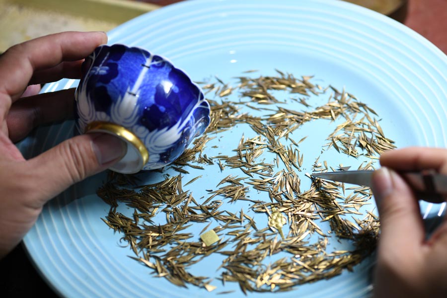 Li Junhang picks a suitable nail for a broken porcelain bowl, at his studio in North China's Hebei province, Aug 6, 2018. [Photo/Xinhua]