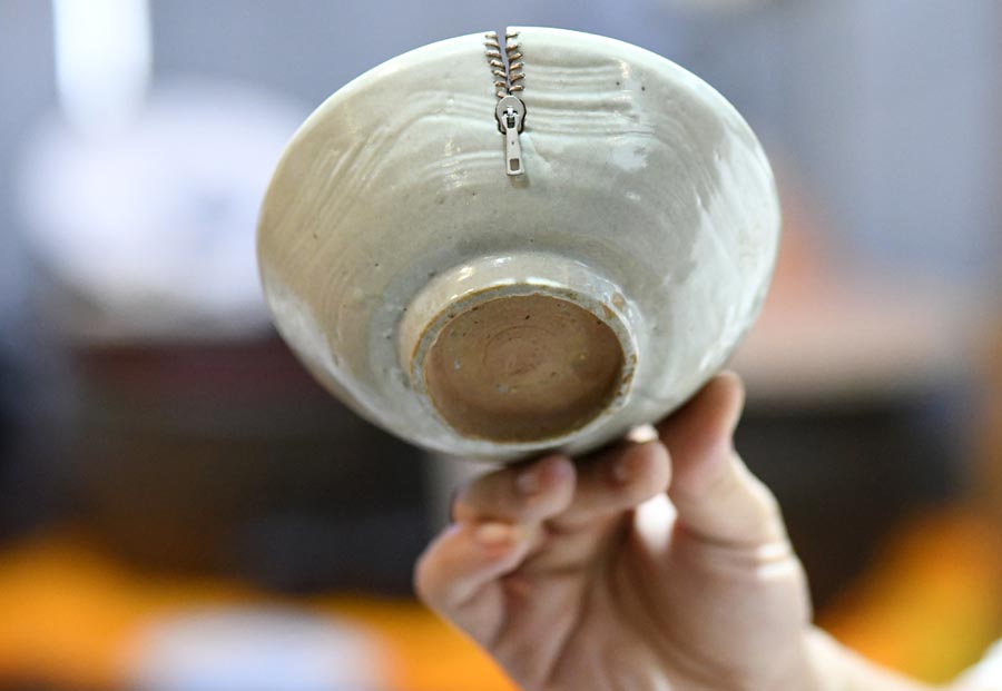 A broken porcelain ware is restored with an artistic touch, resembling the look of a zip. [Photo/Xinhua]
