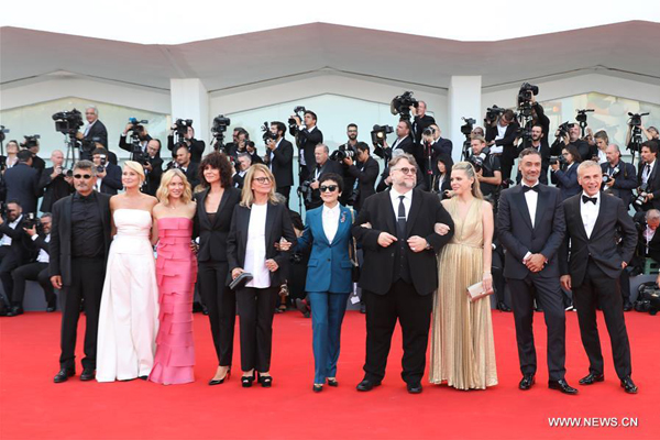 Competition jury president Guillermo Del Toro (4th R) and Kim Morgan (3rd R), and jury members pose on the red carpet of the 75th Venice International Film Festival in Venice, Italy, Aug. 29, 2018. The 75th Venice International Film Festival kicked off here on Wednesday. [Photo/Xinhua] |