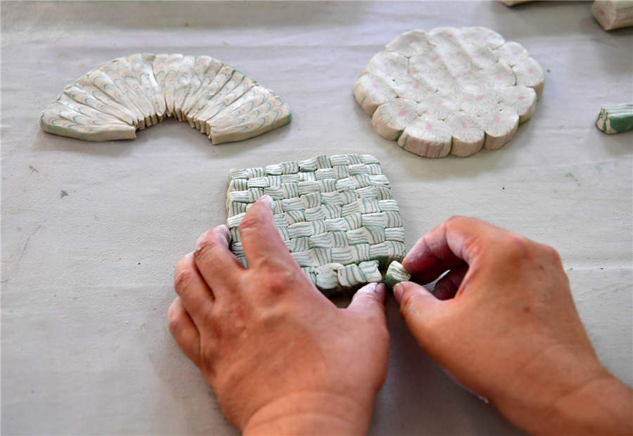 Chai Zhanzhu, the representative inheritor of Dangyangyu kiln Jiao Tai pottery firing, blends clays of differing colours together at Dangyangyu village of Xiuwu county in Jiaozuo, Central China's Henan province, Aug 27, 2018. [Photo/Xinhua]