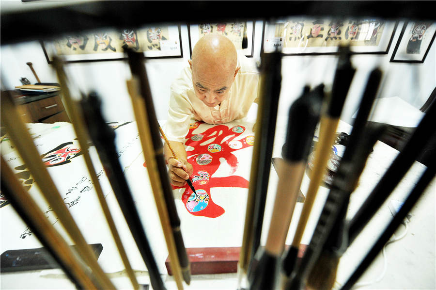 Zhao Xichun works on Peking Opera mask artwork in his workshop in Shaorao city, Jiangxi province on Sept 2, 2018. [Photo by Zhuo Zhongwei and Miao Hui/Asianewsphoto]