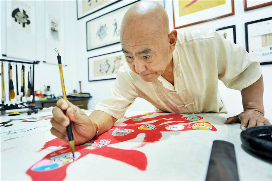 Zhao Xichun works on Peking Opera mask artwork in his workshop in Shaorao city, Jiangxi province on Sept 2, 2018. [Photo by Zhuo Zhongwei and Miao Hui/Asianewsphoto]