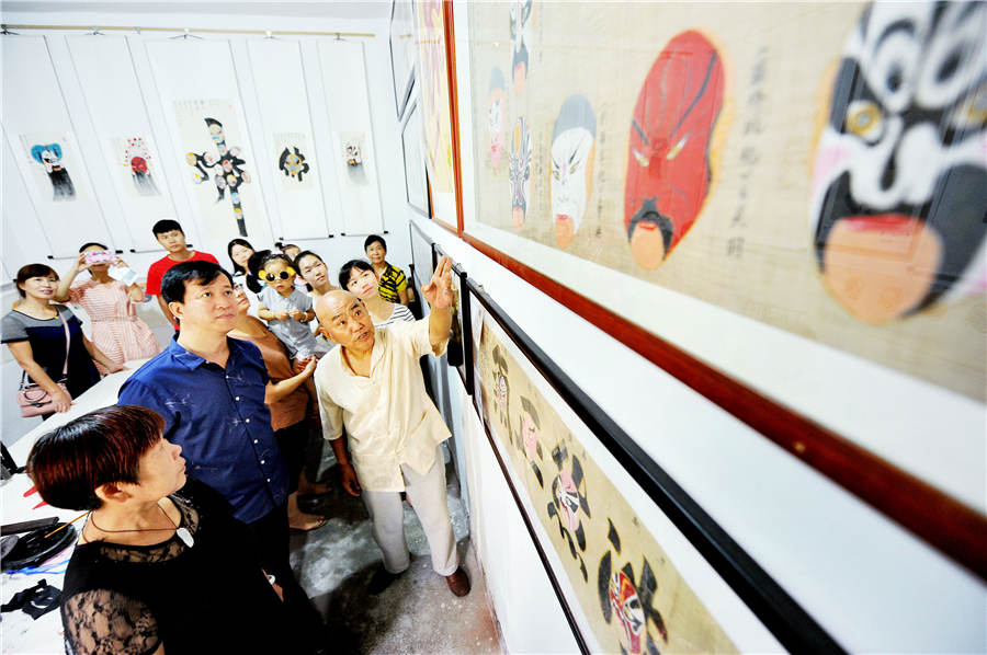 Zhao Xichun introduces his Peking Opera mask scroll in his workshop in Shaorao city, Jiangxi province on Sept 2, 2018. [Photo by Zhuo Zhongwei and Miao Hui/Asianewsphoto]