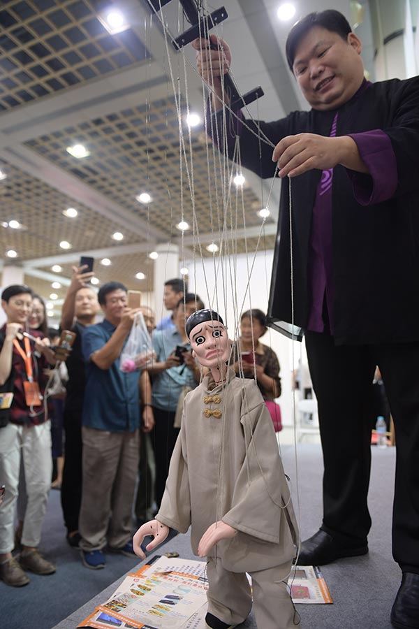 A folk artist performs with a marionette at the 5th China Intangible Cultural Heritage Expo in Jinan, Shandong province, Sept 13, 2018. [Photo/China News Service]