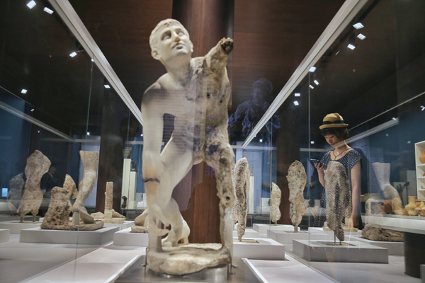 A marble statue of a boy found on a Antikythera shipwreck is also part of the same exhibition being held at the Palace Museum. [PHOTO BY JIANG DONG/CHINA DAILY] |