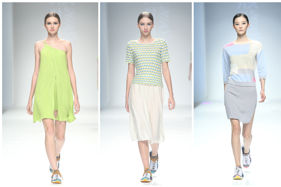 The predominant colors in Zhang's latest collection included fresh greens and blues, bright pink and pale yellow. "We yearn to return to nature with its blue skies, white clouds, green trees and pink flowers. By integrating these natural colors into my garments, I'm trying to call on everyone to experience and enjoy life."