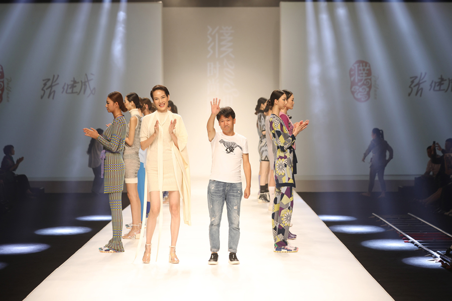 Designer Zhang Jicheng greets the audiences, after presenting his latest looks and vision of the 2019/2020 knitwear fashion trends. [Photo provided to China Daily] |