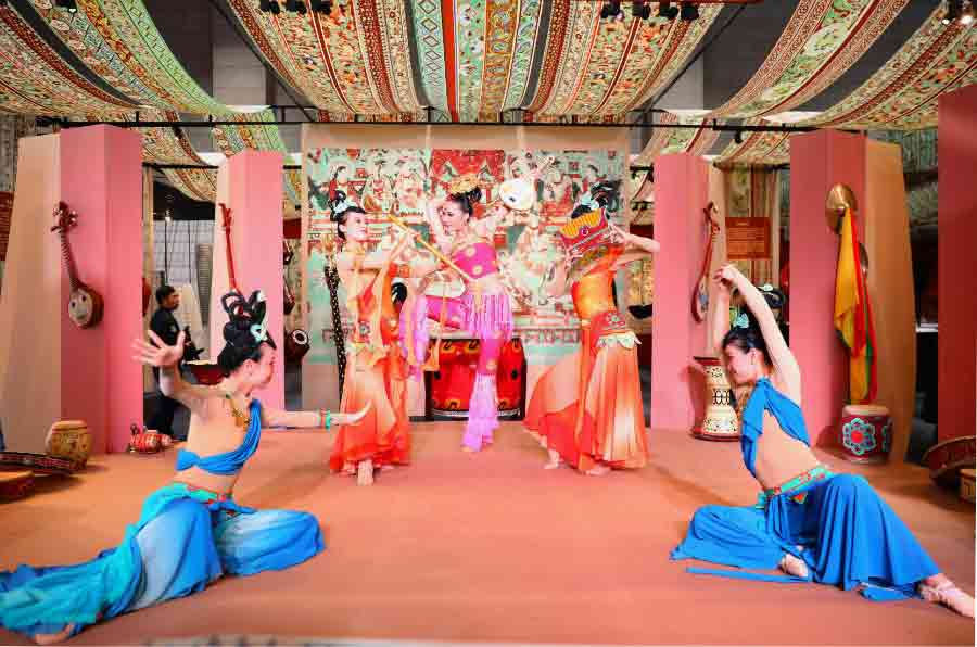 A cultural display featuring 97 kinds of ancient musical instruments, in total 245 pieces, is underway at the Dunhuang International Exhibition Center. All items on show are replicas based upon the images of murals of Mogao Caves. A live musical performance at the exhibition hall showcases the charm of Dunhuang culture. [Photo by Zhang Yuxue/ provided to Chinaculture.org] |