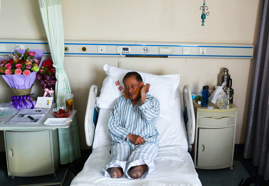Xia receives treatment in a hospital for his frostbitten face and fingers.[Photo by Zhu Xingxin/China Daily] |