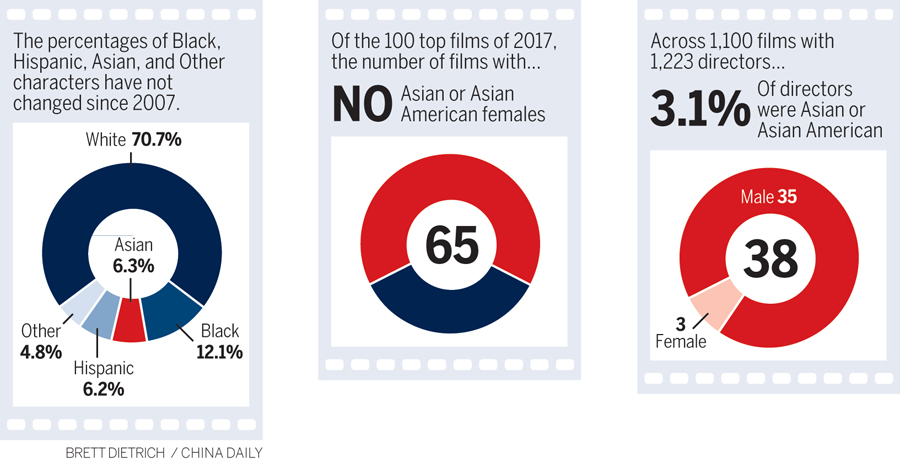 A study by the University of Southern California, which analyzed the top 100 films each year since 2007, found that 65 films in 2017 did not include characters of Asian or Asian American women.