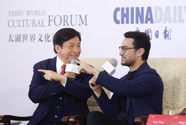 Hong Kong director Stanley Tong (left) and Indian film star Aamir Khan speak at an event on film during the Taihu World Cultural Forum on Friday. [PHOTO BY?FENG YONGBIN/CHINA DAILY] |