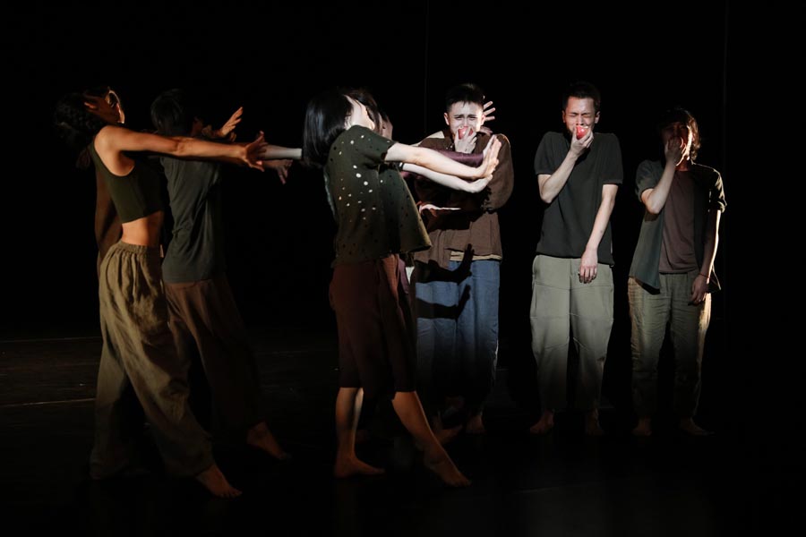 The work follows an unpredictable track from scene to scene, often generating contrasts onstage. For example, in one moment, a performer careens across the stage with legs and arms flailing about, as if ready to fall, while the other dancers crouch in an orderly pattern. In another, while most of the group sways in contentment to a relaxing melody, three performers bite into apples with pained expressions as they stand aside.
