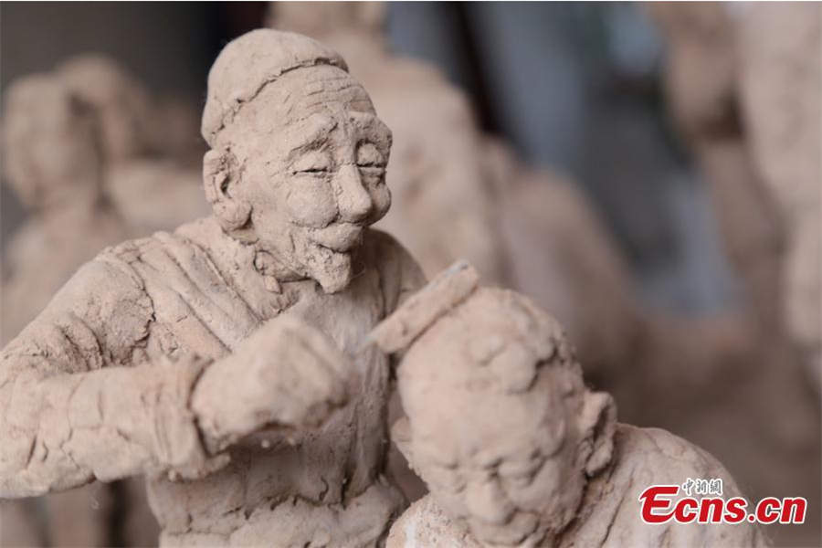 Clay sculpture enthusiast Zhao Tiejun shows his creations featuring past rural life and farming traditions in his home in Pingliang city, Northwest China's Gansu province, Oct 23, 2018. Zhao has been fascinated with the hobby of making clay figurines for two decades as he believes the handicraft can help younger generation learn about the countryside life now increasingly transformed. [Photo/China News Service]