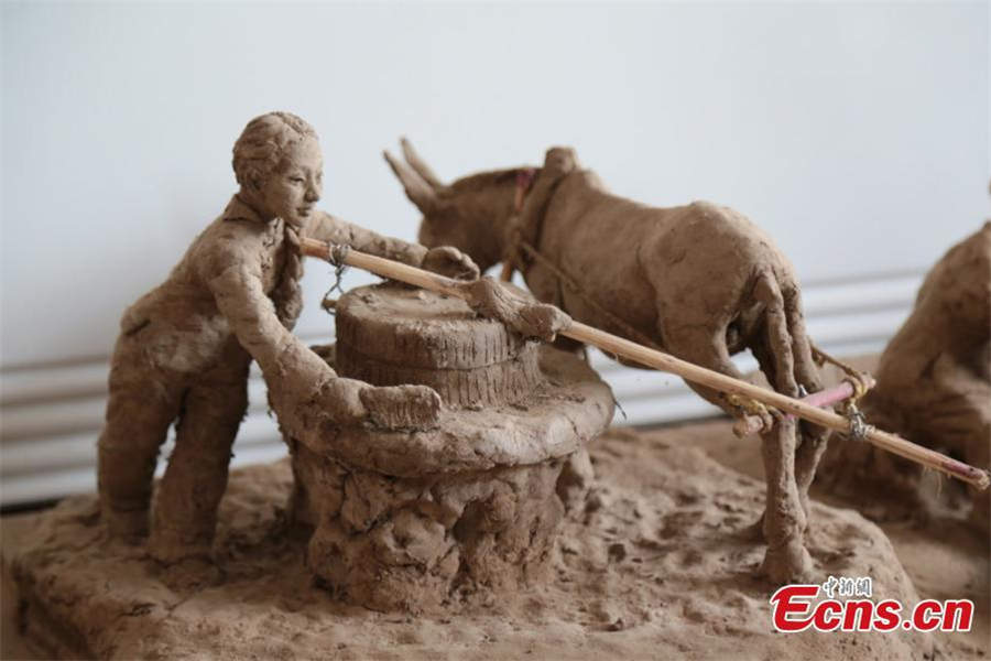 Clay sculpture enthusiast Zhao Tiejun shows his creations featuring past rural life and farming traditions in his home in Pingliang city, Northwest China's Gansu province, Oct 23, 2018. Zhao has been fascinated with the hobby of making clay figurines for two decades as he believes the handicraft can help younger generation learn about the countryside life now increasingly transformed. [Photo/China News Service]