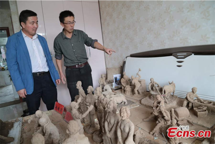 Clay sculpture enthusiast Zhao Tiejun shows his creations featuring past rural life and farming traditions in his home in Pingliang city, Northwest China's Gansu province, Oct 23, 2018. Zhao has been fascinated with the hobby of making clay figurines for two decades as he believes the handicraft can help younger generation learn about the countryside life now increasingly transformed. [Photo/China News Service]