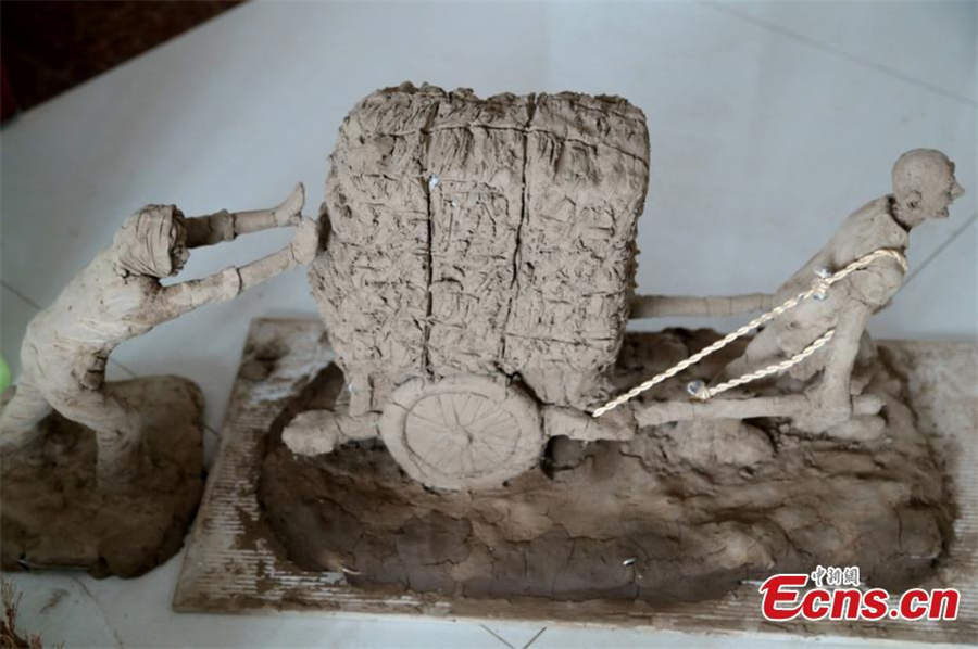 Clay sculpture enthusiast Zhao Tiejun shows his creations featuring past rural life and farming traditions in his home in Pingliang city, Northwest China's Gansu province, Oct 23, 2018. Zhao has been fascinated with the hobby of making clay figurines for two decades as he believes the handicraft can help younger generation learn about the countryside life now increasingly transformed. [Photo/China News Service]