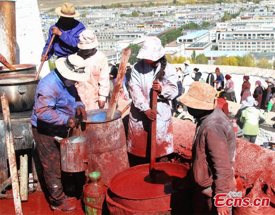 Workers paint the Red Palace, part of the Potala Palace, during annual renovation work following the end of the rainy season in Lhasa, Southwest China's Tibet autonomous region, Oct 23, 2018. [Photo/China News Service]