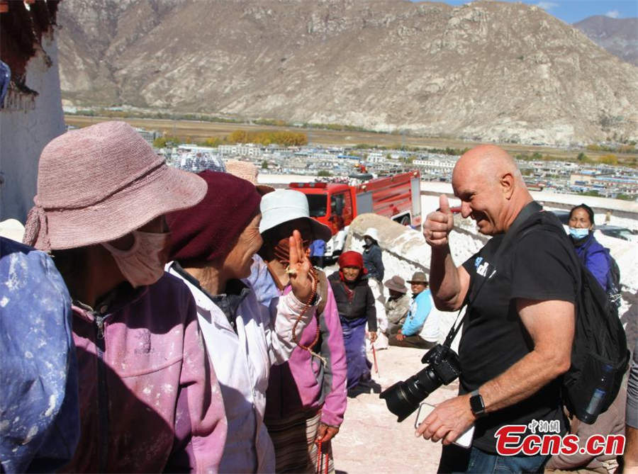A tourist from the United States greets pilgrims to the Potala Palace in Lhasa, Southwest China's Tibet autonomous region, Oct 23, 2018. [Photo/China News Service]