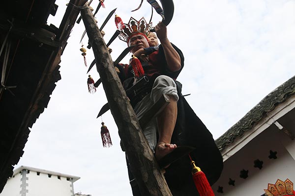 A Tujia man in traditional costume climbs the knife-ladder with bare feet. [Photo by Wu Min/For chinadaily.com.cn] |