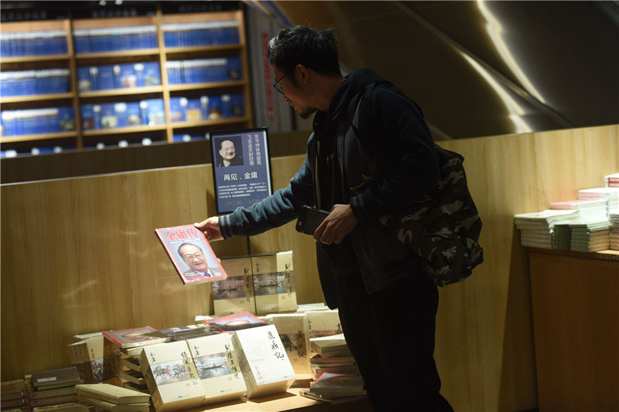 To commemorate the late wuxia novelist Louis Cha, many bookstores in China set up special counters for his books and biographies, attracting readers — especially wuxia fans. A Xinhua Bookstore in Hangzhou, East China's Zhejiang province, offers one such collection on Oct 31, 2018. [Photo by Long Wei/Asianewsphoto]