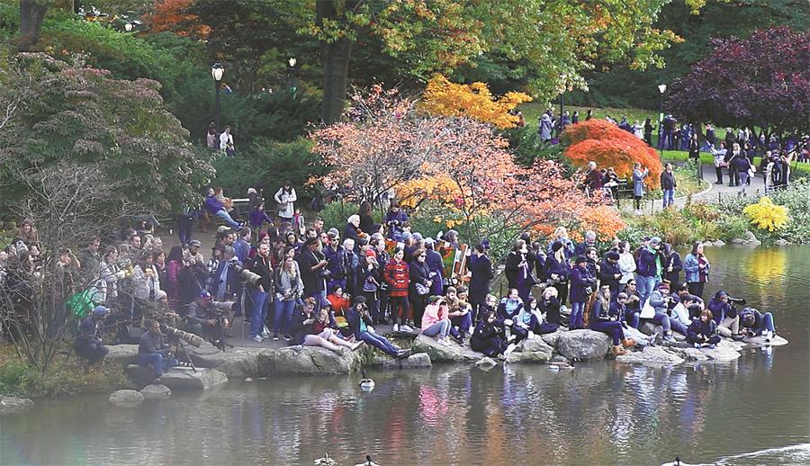 People?gather?at?the?Pond?in?New?York’s?Central?Park?to?enjoy?the?rare?appearance?of?a?male Mandarin?Duck. KONG?WENZHENG?/?CHINA?DAILY |