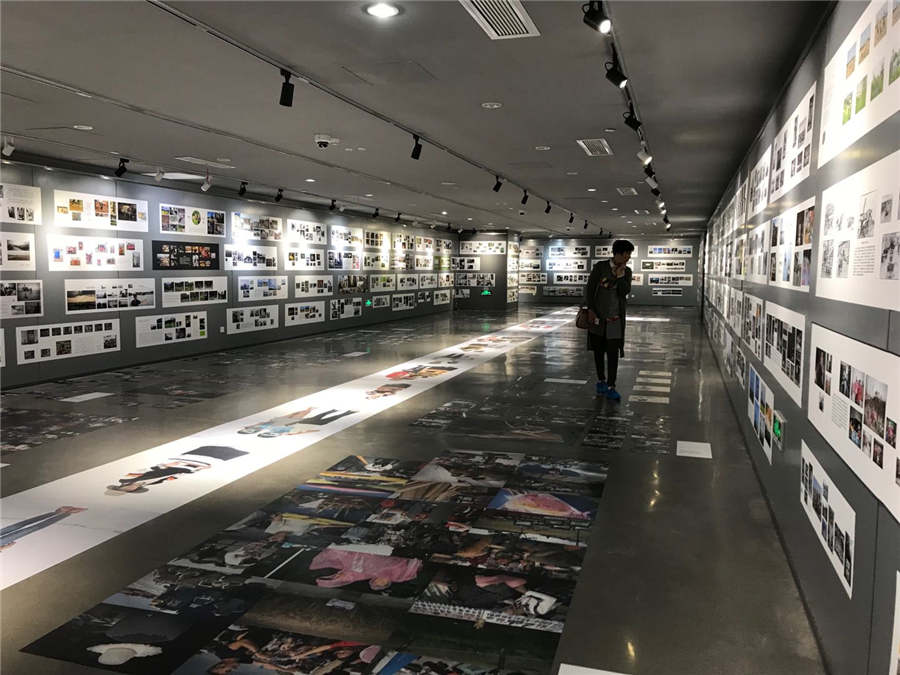A visitor views long scrolls of photos during the 3rd Ningbo International Photography Week held in Ningbo city, Zhejiang province, Oct 28, 2018. [Photo by Wu Xiaohui/Asianewsphoto]