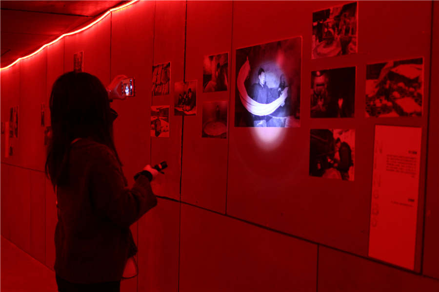 A visitor views photos using a flashlight during the 3rd Ningbo International Photography Week held in Ningbo city, Zhejiang province, Oct 28, 2018. [Photo by Wu Xiaohui/Asianewsphoto]