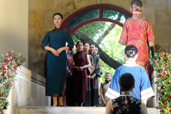 Models present handmade cheongsams during a show at the Silk Museum in Suzhou, Jiangsu province on November 10, 2018. [Photo/Xinhua]
