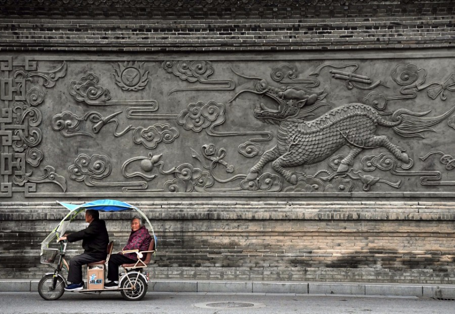 Two elders ride a tricycle past the historical site of the ancient Neixiang County Government Office in Neixiang county, Central China's Henan province, Nov 14, 2018. The Neixiang County Government Office, or Neixiang Magistrate Office, was first set up in 1304 of the Yuan Dynasty (1271-1368). The architectural complex, covering an area of over 40,000 square meters and comprising more than 200 rooms, is one of the best preserved county level magistrate offices in the feudal times.[Photo/Xinhua]