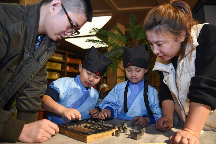 Teachers show the process of movable-type painting to the pupils in Jiuwu Cultural City, Shenyang, on Nov 18. [Photo/Xinhua]