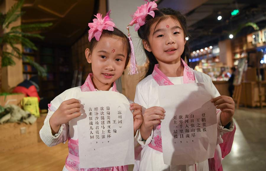 Two girls show their fruits of the movable-type printing experience course in Jiuwu Cultural City, Shenyang, on Nov 18. [Photo/Xinhua]