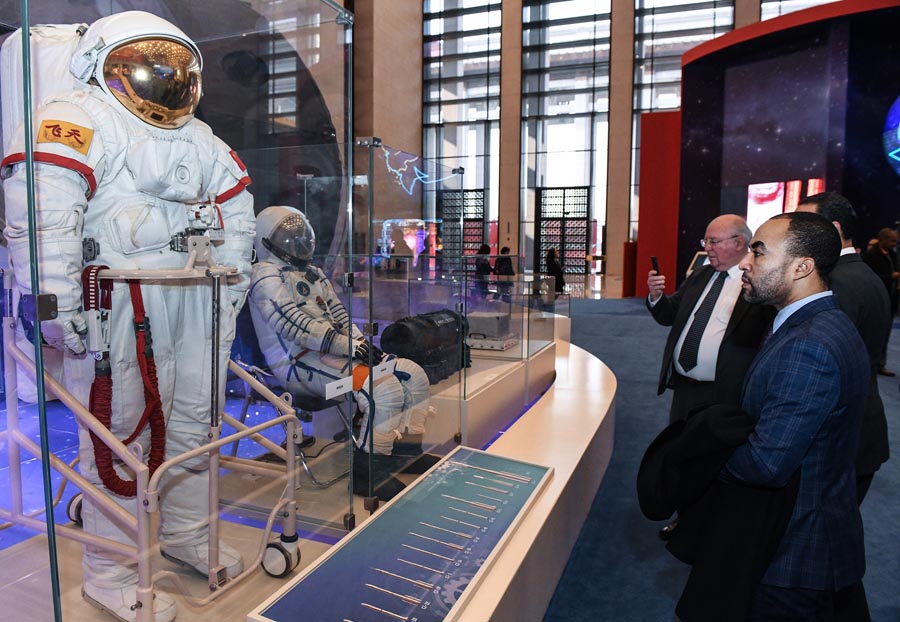 Foreign visitors look at spacesuits on display at the National Museum of China on Nov 19, 2018. [Photo/Xinhua] |
