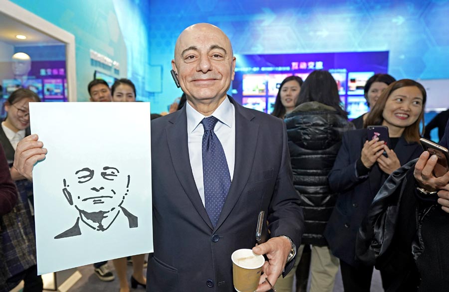 Imad Moustapha, Syrian ambassador to China, takes a photo with his portrait drawn by a robot artist at the National Museum of China on Nov 19, 2018. [Photo/Xinhua]